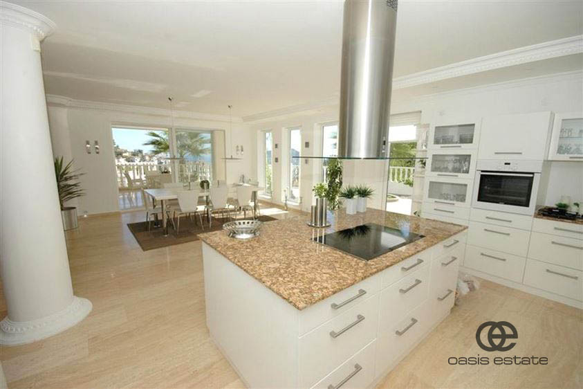 Interior Of White Tile Kitchen With Big Window With A Mountain